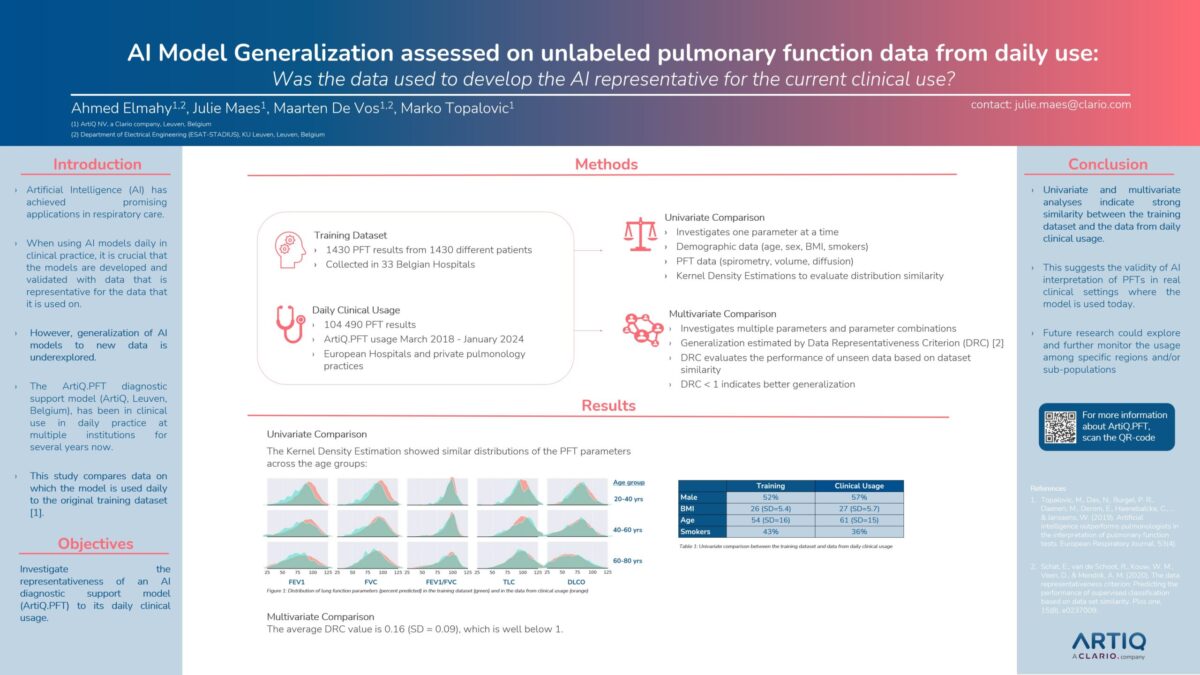 Methods: We compared the training dataset (n=1430) against the clinical usage from March 2018 until January 2024 (n=104490). Univariate analysis included demographic and PFT data (spirometry, volume, diffusion). We estimated multivariate generalization using the Data Representativeness Criterion (DRC, Schat et al) that evaluates performance on unseen data based on dataset similarity. A DRC below 1 indicates better generalization.
