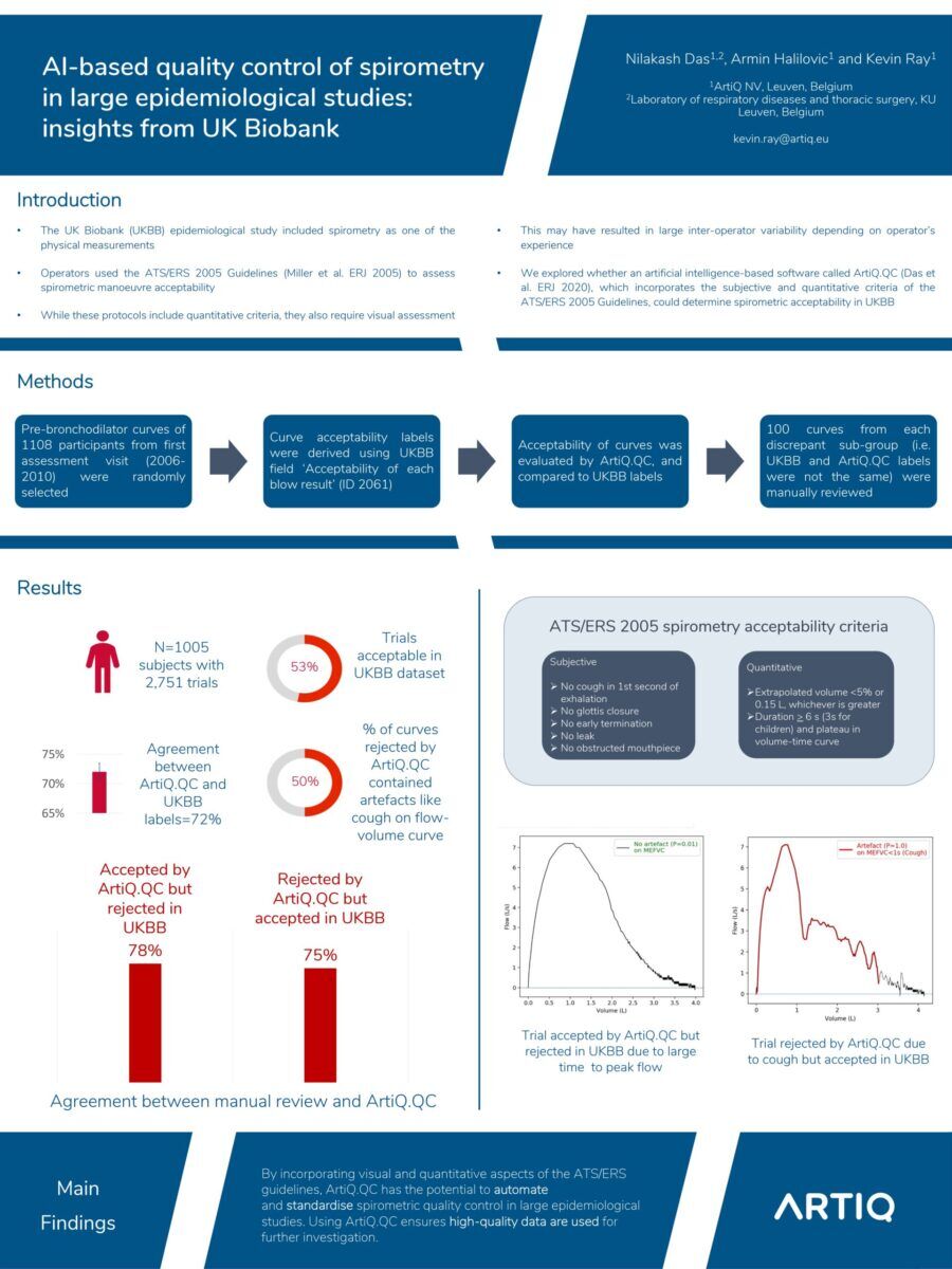 Introduction: Spirometry manoeuvre acceptability in the UK Biobank (UKBB) study was assessed using This may have resulted in a large inter-operator variability that was dependent on the operator’s experience. We explored an artificial intelligence (AI)-based software called ArtiQ.QC (Das et al. ERJ 2020) that incorporates visual experience of a trained operator and quantitative guidelines in determining spirometric acceptability in UKBB.