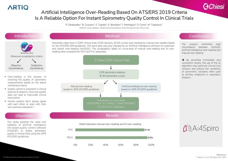 Conclusion: The results reconfirmed a high level of concordance between the AI quality control software and the human over-readers also with the use of the 2019 ATS/ERS guidelines. By providing immediate and consistent results, the use of the AI algorithm may optimize clinical trial conduct and reduce the variability of spirometry variables often used as primary endpoints in respiratory trials.