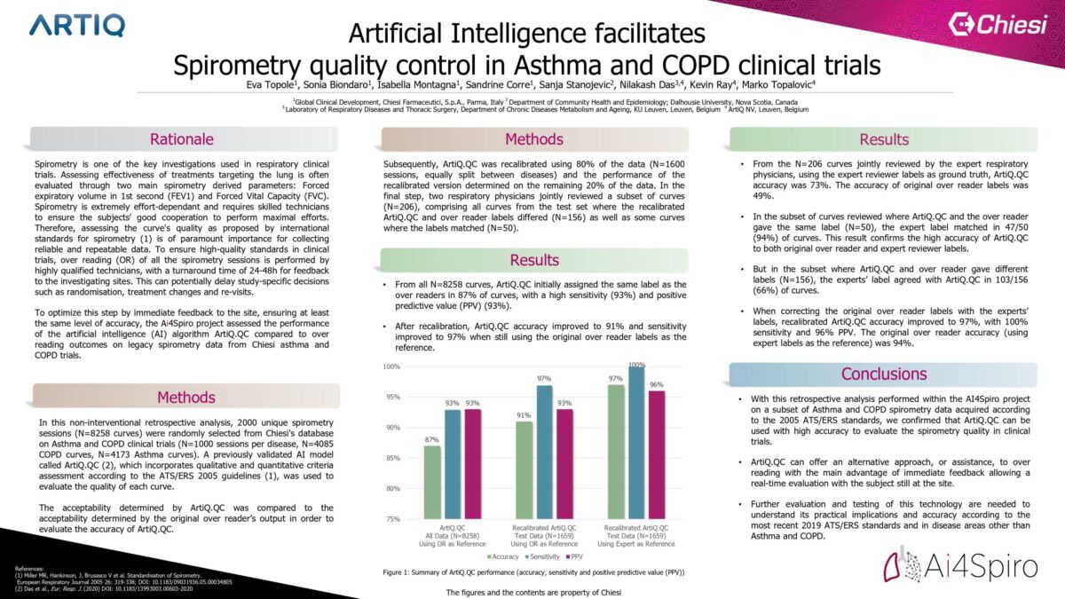 Conclusion: ArtiQ.QC software results are comparable to the over-reader’s and could assist in the quality assessment of spirometry in clinical trials. By providing immediate and consistent results, using ArtiQ.QC may benefit clinical trial conduct and reduce the variability in outcomes.