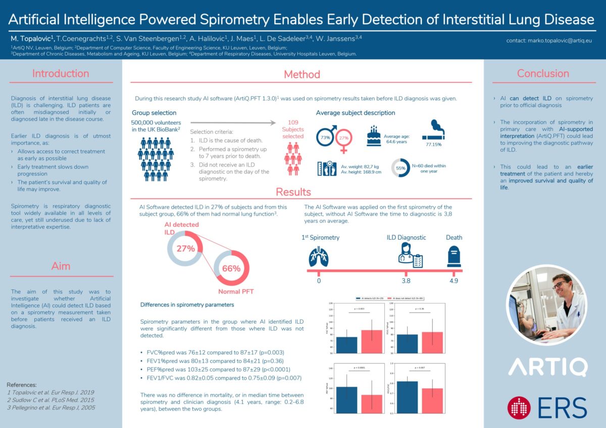 Conclusion: In one quarter of patients, AI detected ILD many years before clinical diagnosis. Most had lung function within normal ranges, suggesting that AI may detect ILD prior to standard spirometry interpretation. With further validation, merging AI-support and regular spirometry testing may lead to earlier ILD diagnosis.