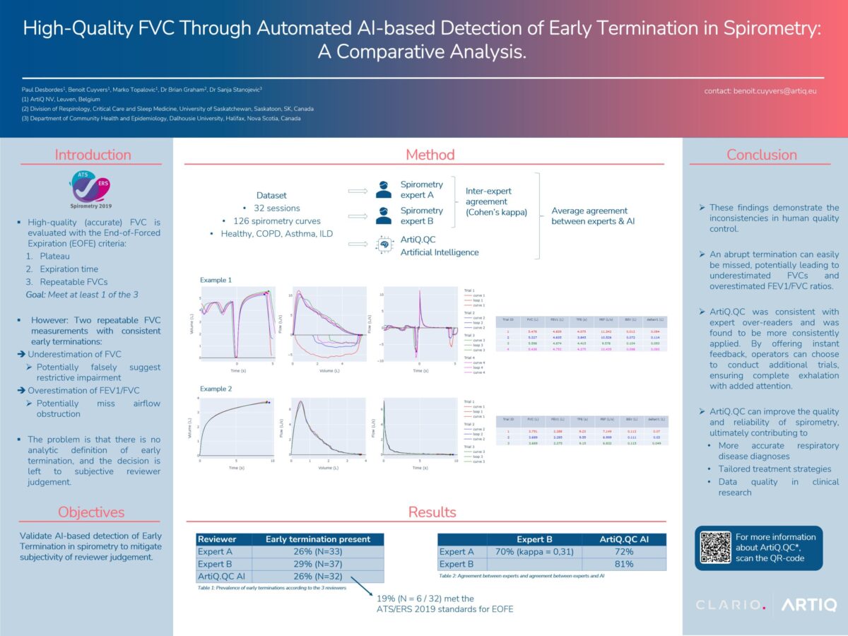 Results: Expert A and Expert B identified early termination in 26% (N=33) and 29% (N=37) of the graphs respectively. The inter-reader agreement was fair with a Cohen’s kappa of 0.31 (70% of agreement). ArtiQ.QC detected early termination in 26% of the graphs (N = 32), with agreement of 72% with Expert A and 81% with Expert B. Notably, 19% (N=6/32) of the graphs with early termination detected by ArtiQ.QC would have met EOFE criteria (repeatable FVC) according to the 2019 standards.