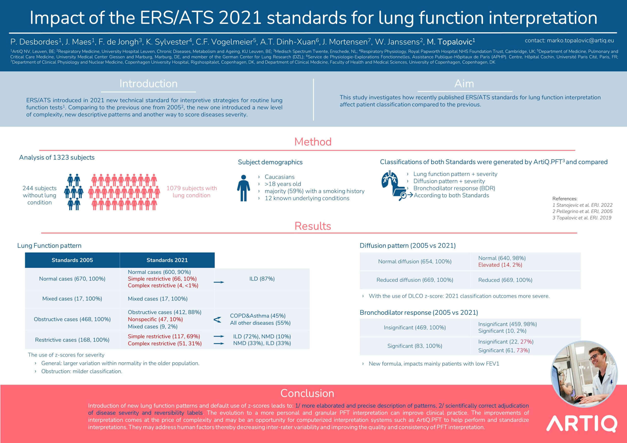 Methods: 1323 subjects (244 without and 1079 with a lung condition) who performed a complete PFT at the UZ Leuven (Belgium) are retrospectively analysed. Subjects were Caucasians, over 18 years old, with a majority (59%) with a smoking history and known underlying conditions. Labels for lung function pattern and severity, diffusion pattern and severity and bronchodilator response (BDR) according to both guidelines were generated using interpretative software (ArtiQ.PFT v1.5.0, ArtiQ NV, Belgium).