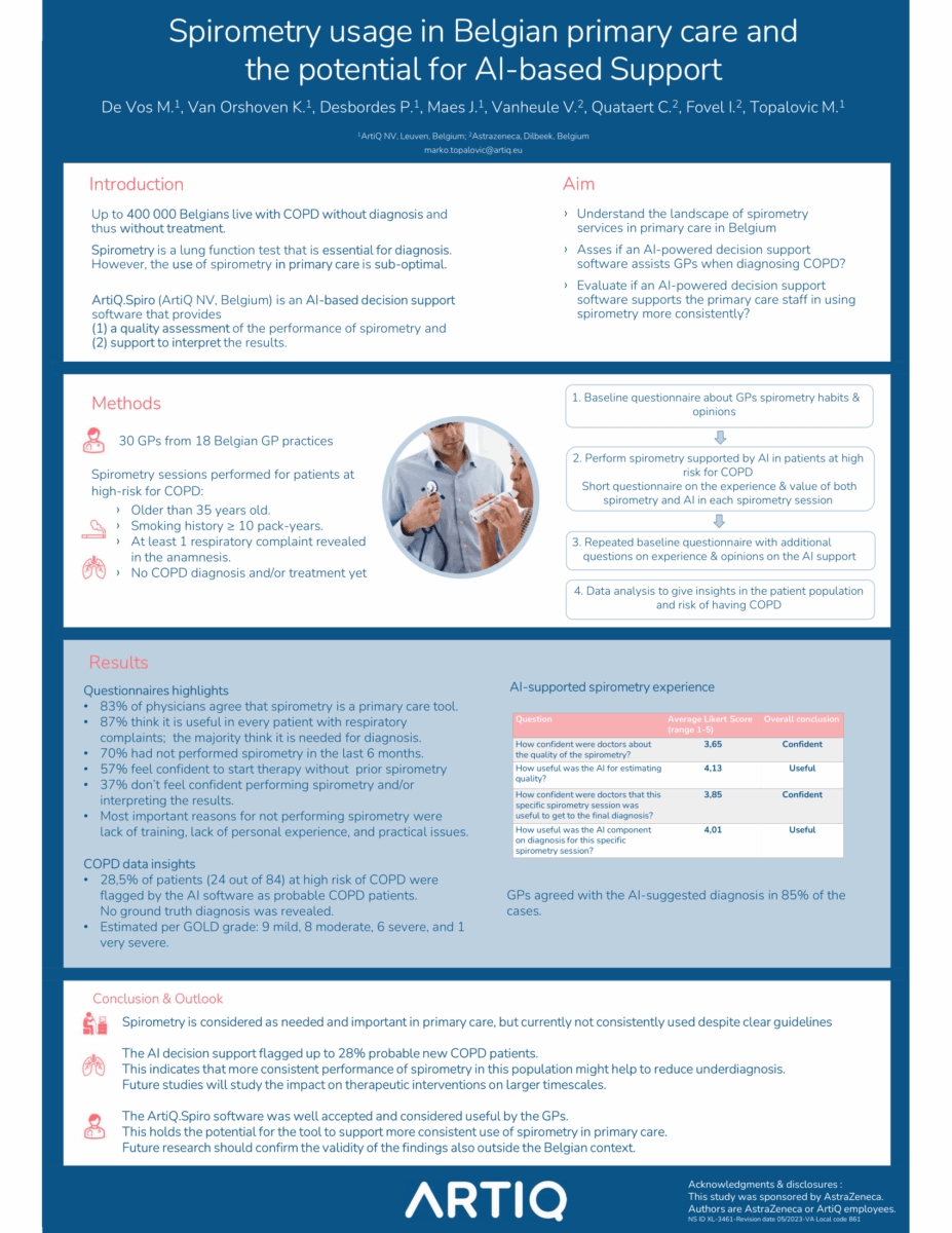 Results: Questionnaires revealed that spirometry is important in primary care, but it is currently not used according to the latest guidelines. Barriers relate to lack of good training and time pressure. 28.5% of patients at risk of COPD were flagged as having COPD. ArtiQ.Spiro was useful for both quality assessment (4.13/5) and diagnostic support (4.01/5).